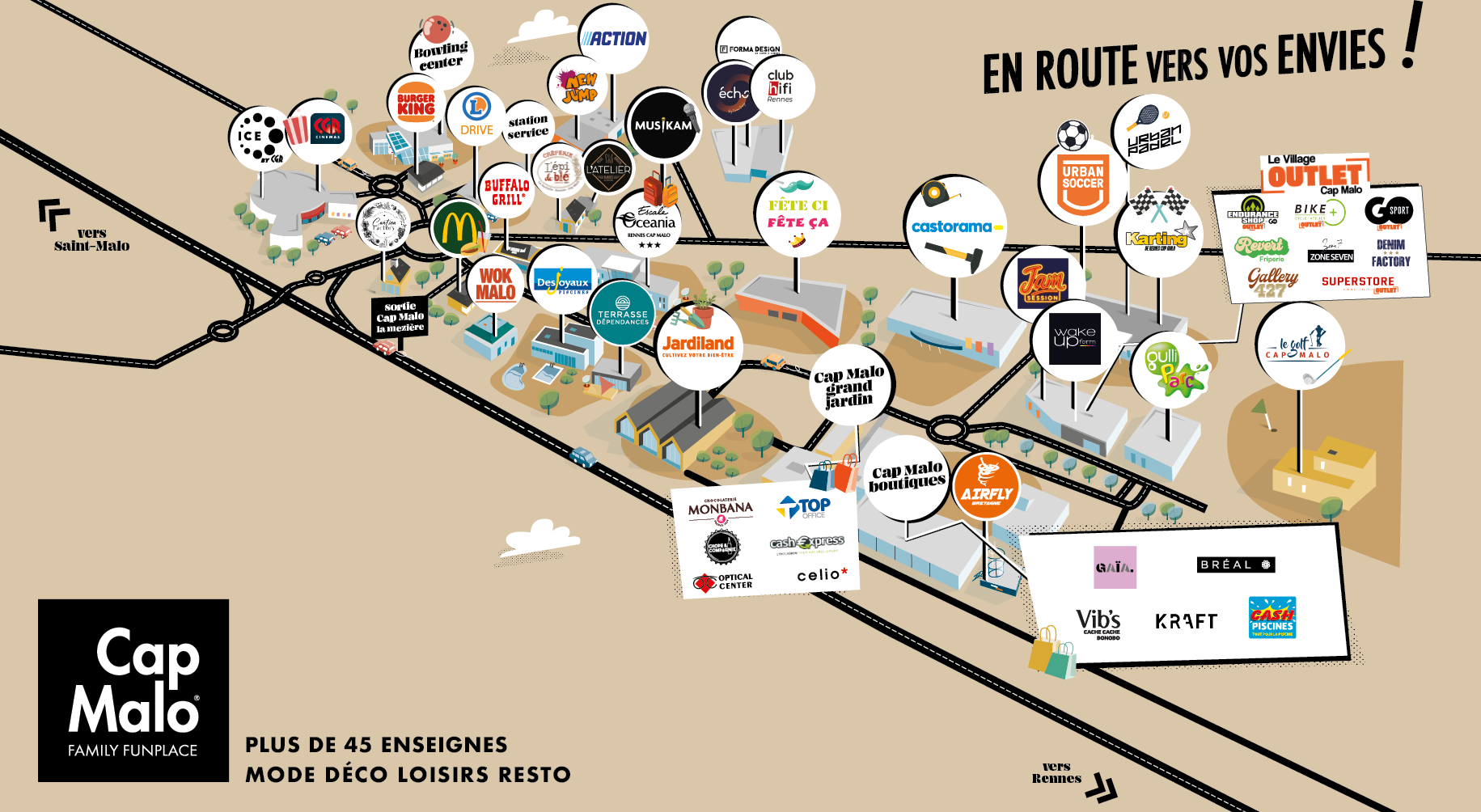 Complexe commercial à 5 min de Rennes pour toute la famille alliant shopping, loisirs et restauration.